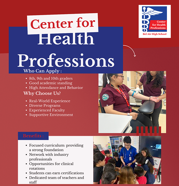 The Center for Health Professions at Bel Air HS is a health care professional preparation program offered to students throughout the El Paso County area.